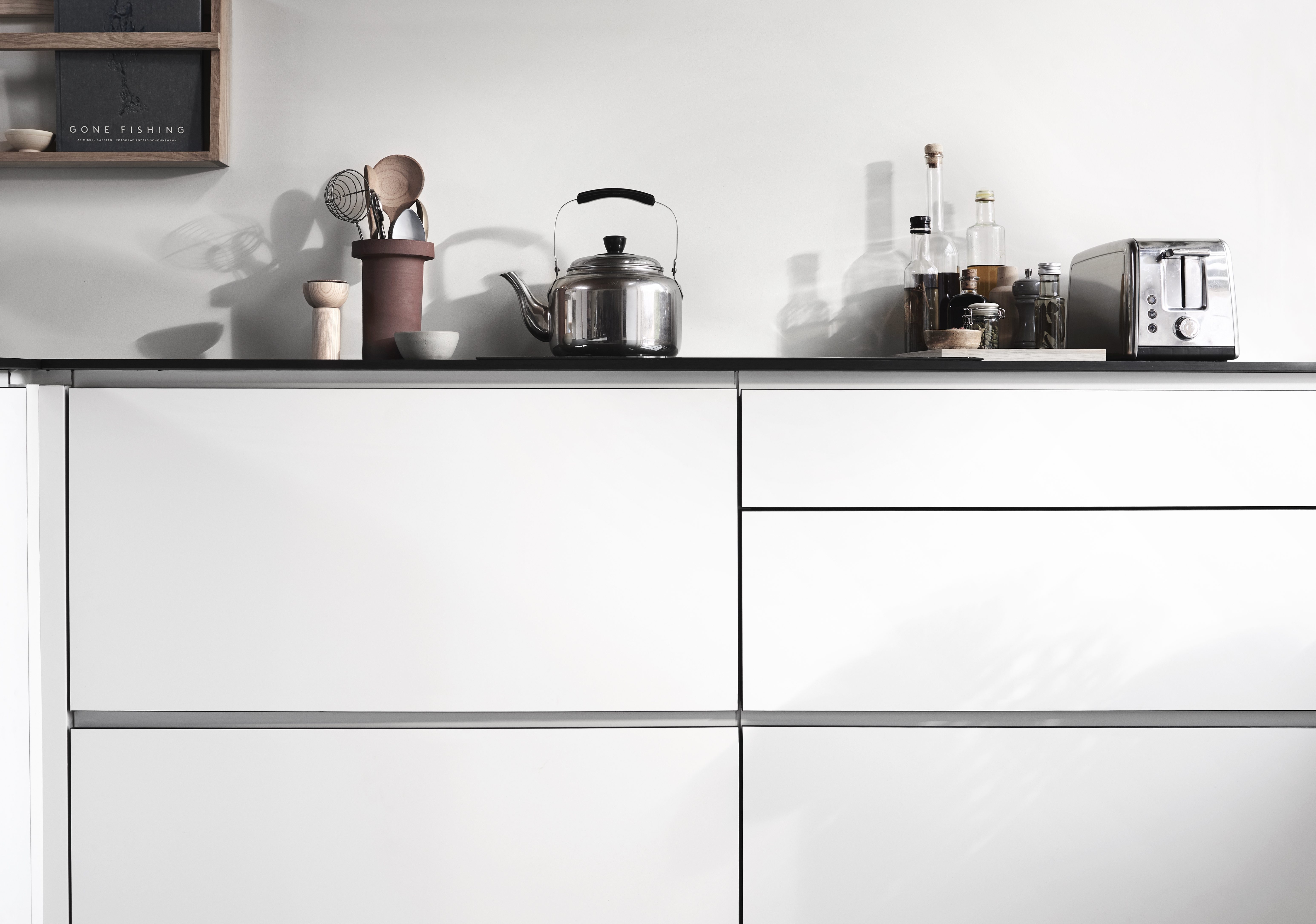 MANO hvidt køkken med slanke skabe, minimalistisk design og træbordplader, der blander skandinavisk elegance med funktionel modernitet.