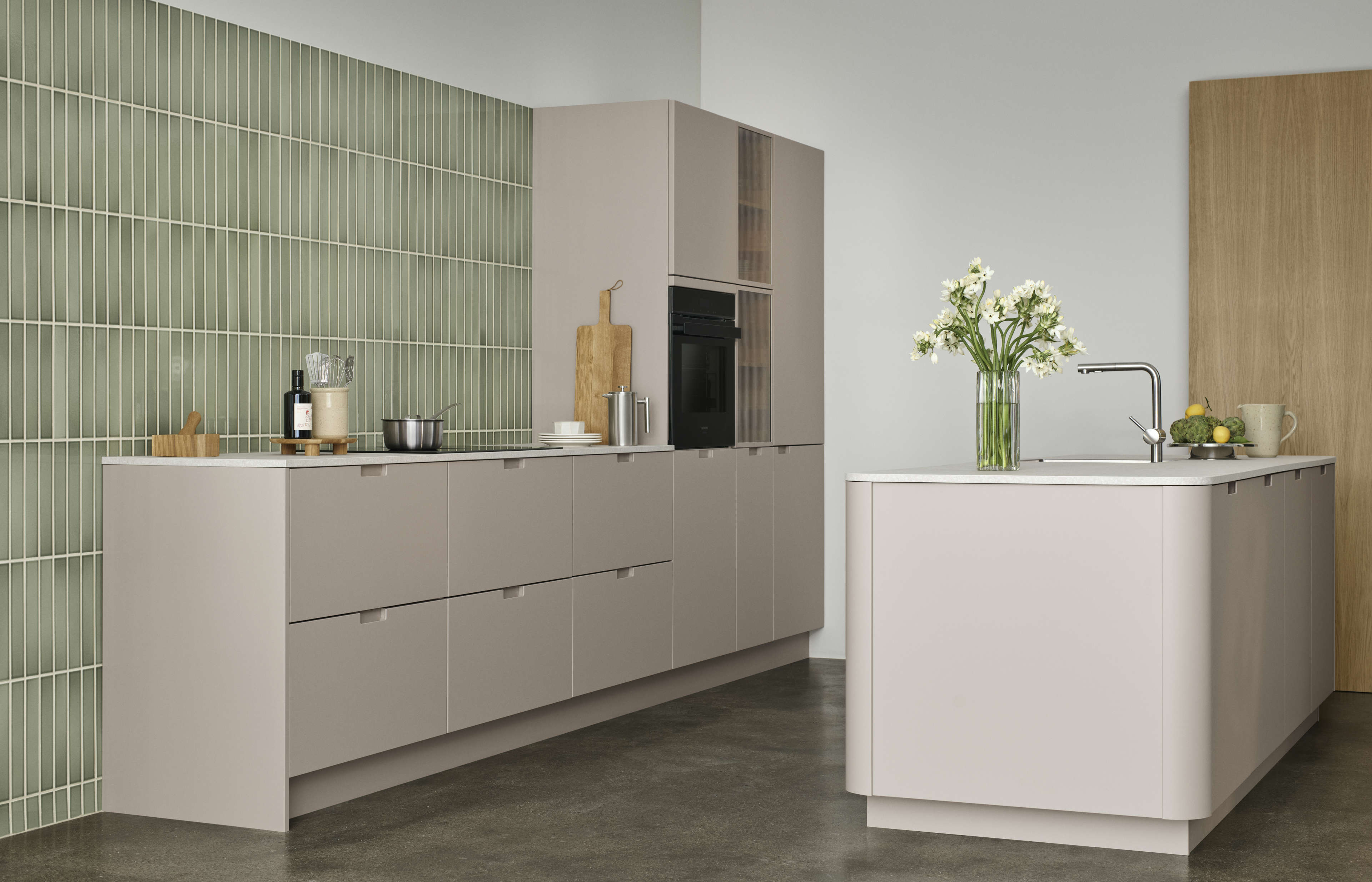 Evento følger tidens trends med sit organiske design, hvor de afrundede kanter giver køkkenet et smukt udtryk. De opbløder rummets geometri og skaber en flydende og naturlig æstetik, der opfylder vores ønske om at introducere organiske former i vores køkkener. De afrundede kanter er mere end et designvalg. De signalerer en livsstil med fokus på harmoni og flow med en visuelt beroligende og taktil oplevelse. Med Evento er køkkenet ikke bare et sted, hvor du laver mad. Det er et rum, der afspejler naturens organiske former med en rolig og indbydende atmosfære.