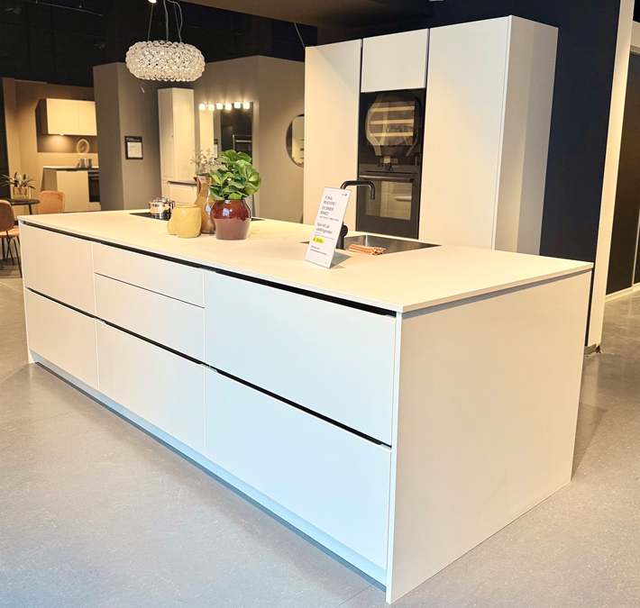 Elementer: Stor ø, højskabe, bordplade, vask og vandhane. Bambus indsatser i skuffer