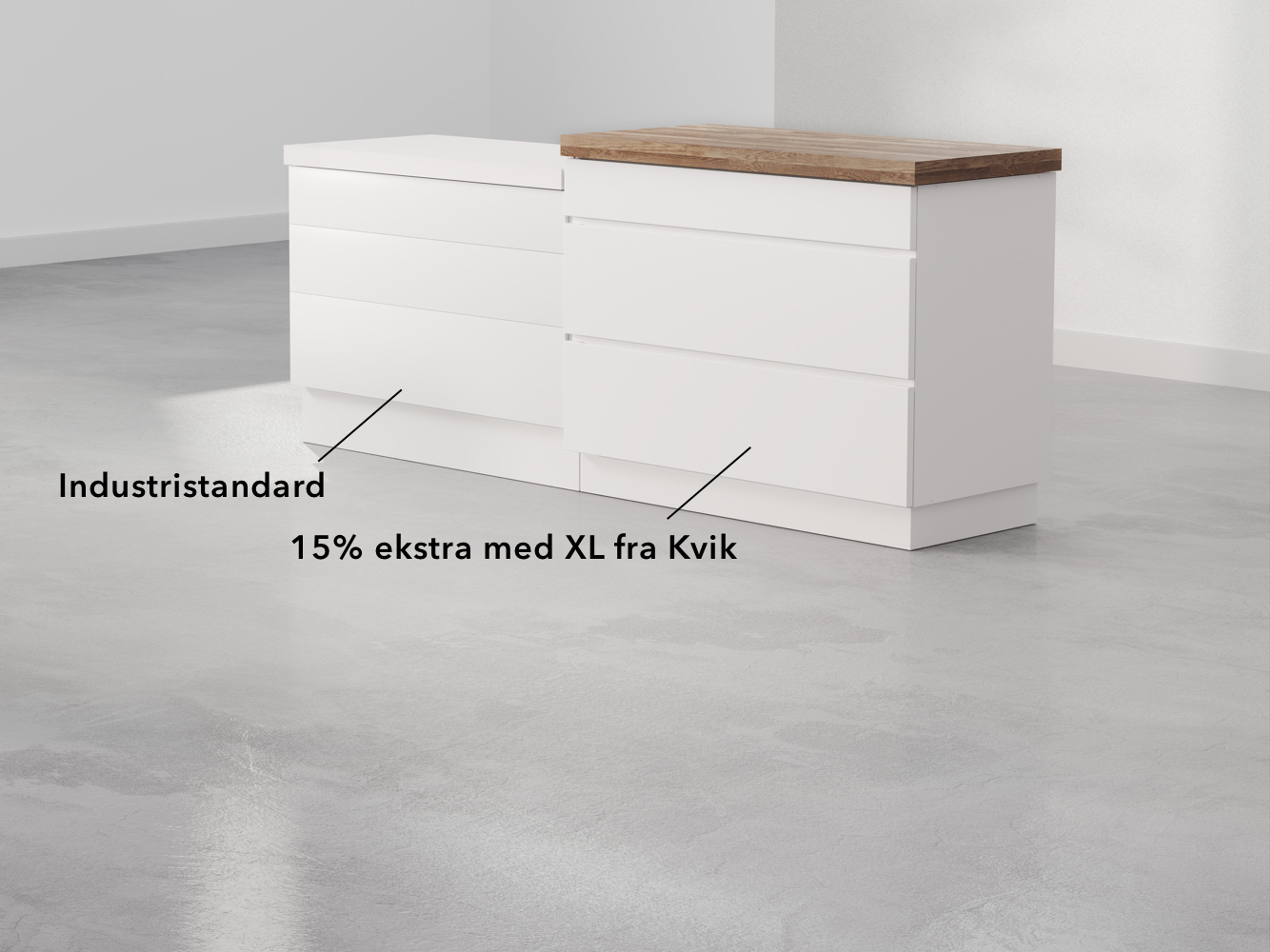 Vores XL by Kvik-skabe giver dig 15% mere plads uden ekstra omkostninger. Og vælger du XXL, får du 40% mere plads. På den måde får du masser af skabsplads og bordpladeplads til en pris, der ikke vælter budgettet.